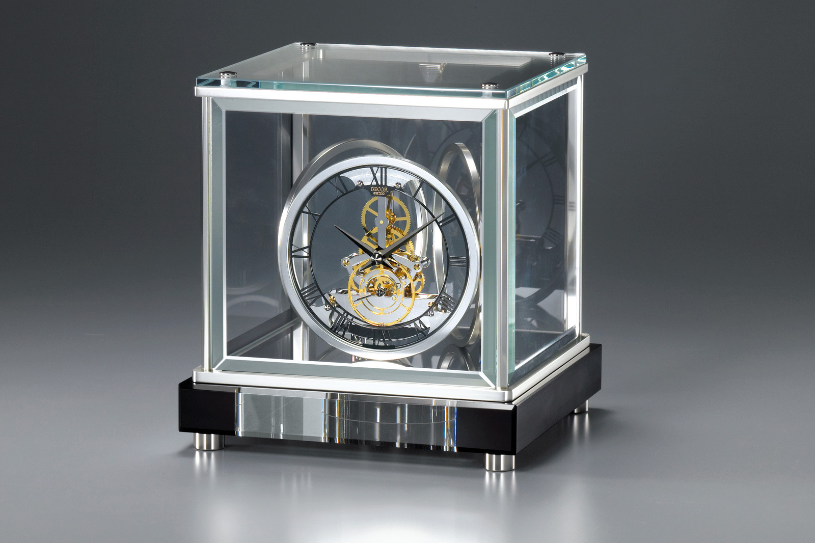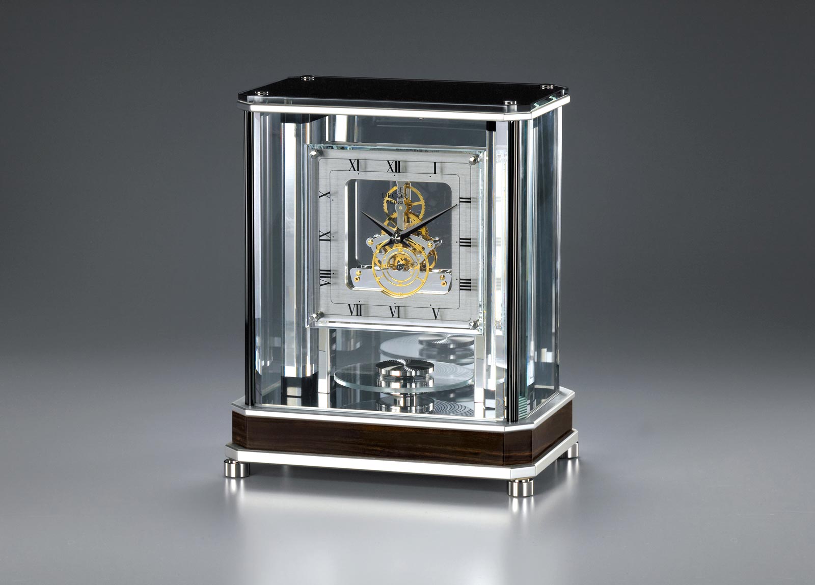 Designed in the shape of a building. The beveled glass and mirror surfaces create captivating reflections changing constantly with the viewing angle, much like a kaleidoscope. The rotating ornament is an expression of the eternal flow of time, with the quartz skeleton clock movement's precision gears and wheel train always in motion and visible through the glass casing, reminiscent of the swirling within the Milky Way.