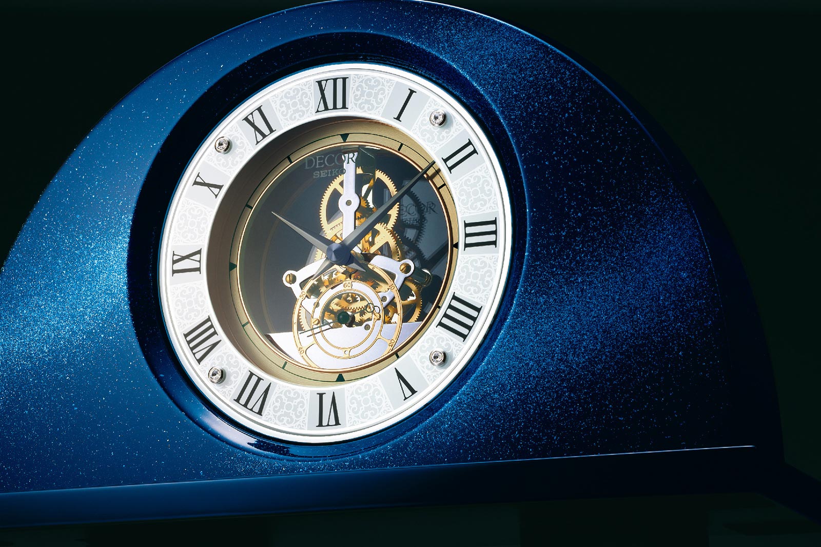 Despite having a modern quartz movement, this clock allows you to enjoy the beauty of a classical gear train reminiscent of a mechanical timepiece. The front dial is adorned with an intricate arabesque pattern, and the semicircular frame is painted with Echizen lacquer and blue galaxy urushi lacquer to create an elegant representation of the Milky Way glittering in the expanse of the night sky.